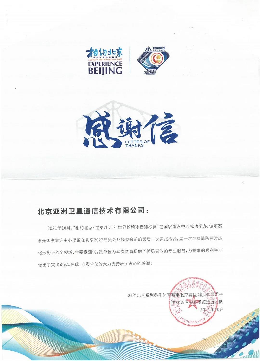 喜訊——我司國家游泳中心冬奧會冰壺場館信息化項目收到相約北京系列冬季體育賽事北京賽區(qū)組委會感謝信!